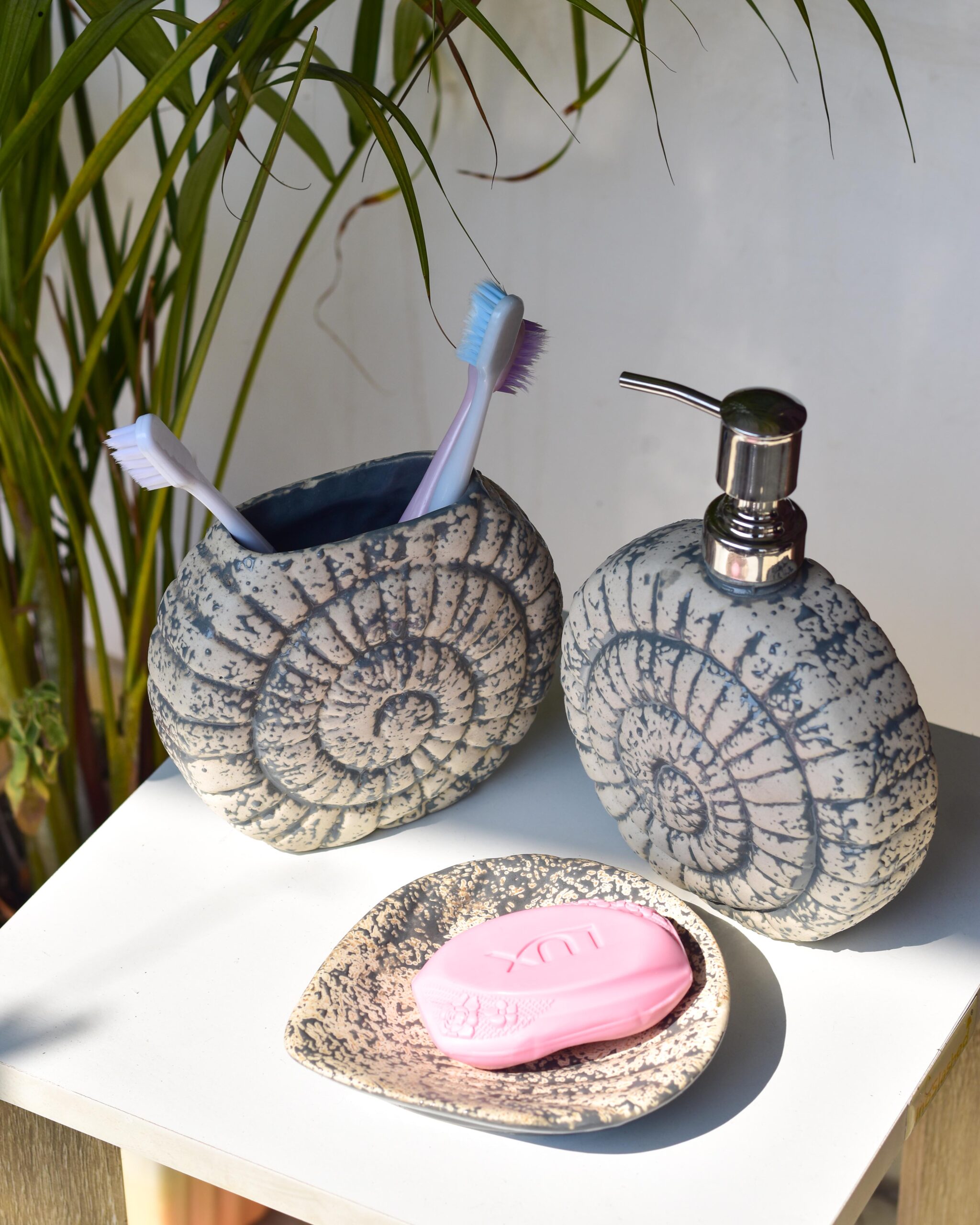 Bring coastal elegance to your space with this beautifully sculpted ceramic bathroom set, inspired by the timeless spiral of ocean fossils. Designed with a textured shell pattern in soft neutral tones, this handcrafted trio blends earthy charm with modern sophistication.
